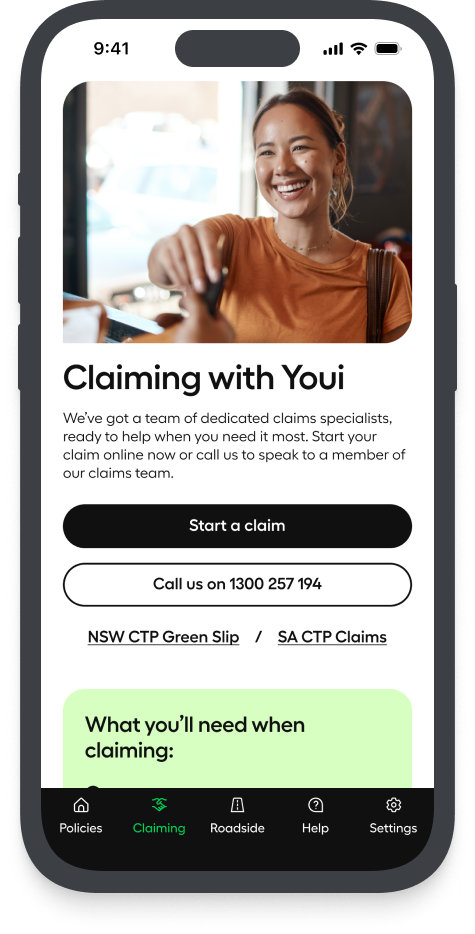 The Youi App includes features that facilitate policy management, including requesting a quote on a new policy, starting and tracking claims, requesting roadside assistance, and more.